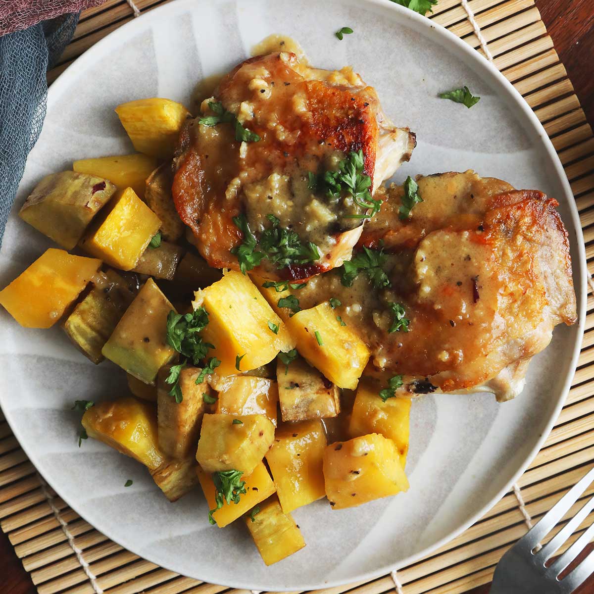 - In a baking tray, pour the cider glaze over the seared chicken thighs. Add sweet potato cubes to the baking tray. Then, transfer the tray to the preheated oven and bake for about 20-25 minutes, or until the chicken and sweet potato is cooked through, and the glaze has caramelized.