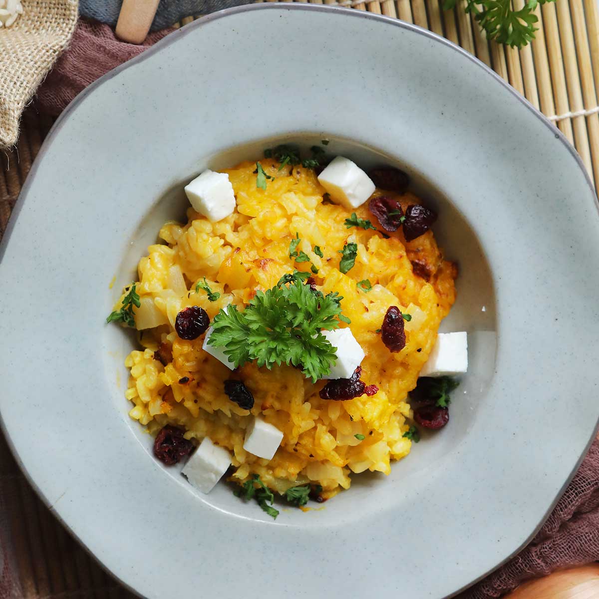 - Remove from the oven, garnish with fresh parsley, and serve your Easy Baked Pumpkin Risotto hot. Enjoy!