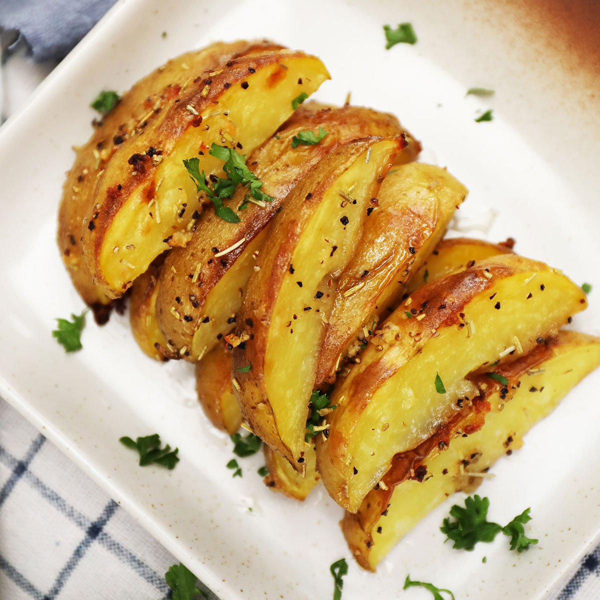 Place the potato wedges in a large mixing bowl and drizzle the garlic butter mixture over them. Toss the wedges to ensure even coating.