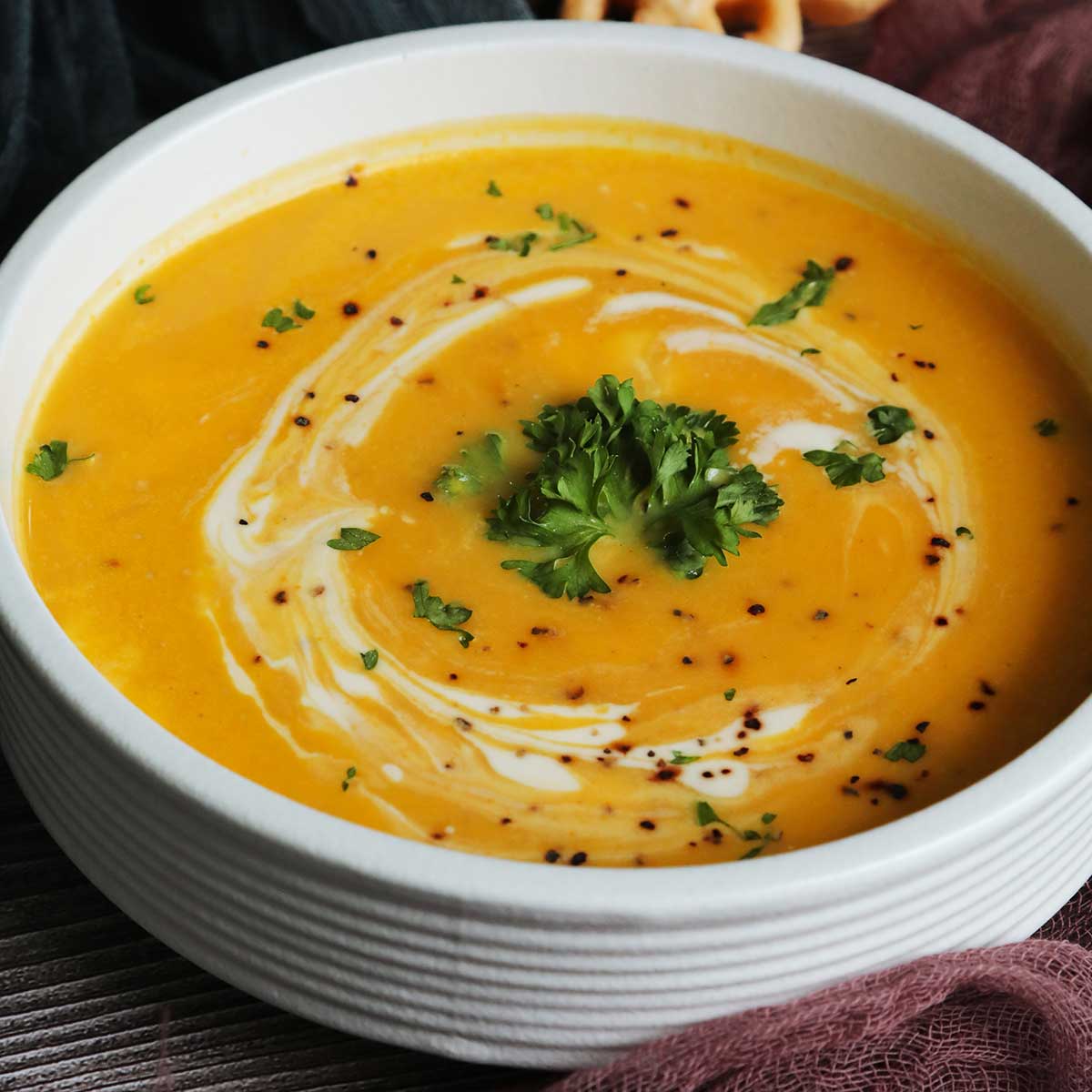 Serve the Pumpkin Soup hot with a dollop of sour cream and a sprinkle of fresh herbs.